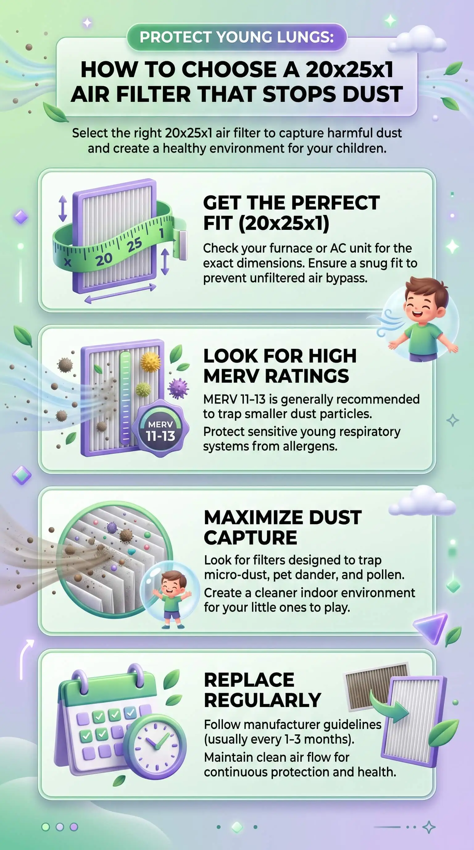 The 20x25x1 filter isn't a complicated product. Choosing the right one for a home with young children, and changing it often enough to matter, takes less than five minutes of reading and about sixty seconds of actual work every month. The parents who see the most consistent improvement in their home's air quality aren't the ones who buy the highest-rated filter on the market. They're the ones who buy the right filter for their system, seat it correctly, and replace it on a schedule they actually keep.