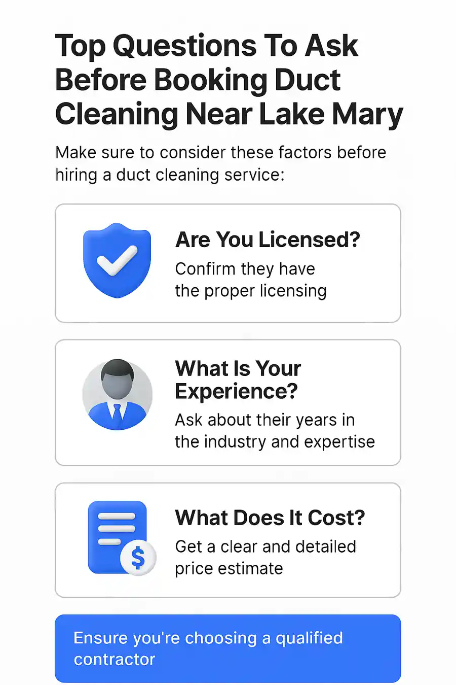 "From our experience helping homeowners in Lake Mary, we’ve seen that asking the right questions before booking duct cleaning isn’t just smart—it’s essential. It ensures your HVAC system is properly maintained, your home stays healthy, and you avoid unnecessary costs. Knowledgeable homeowners consistently get cleaner air and longer-lasting results."